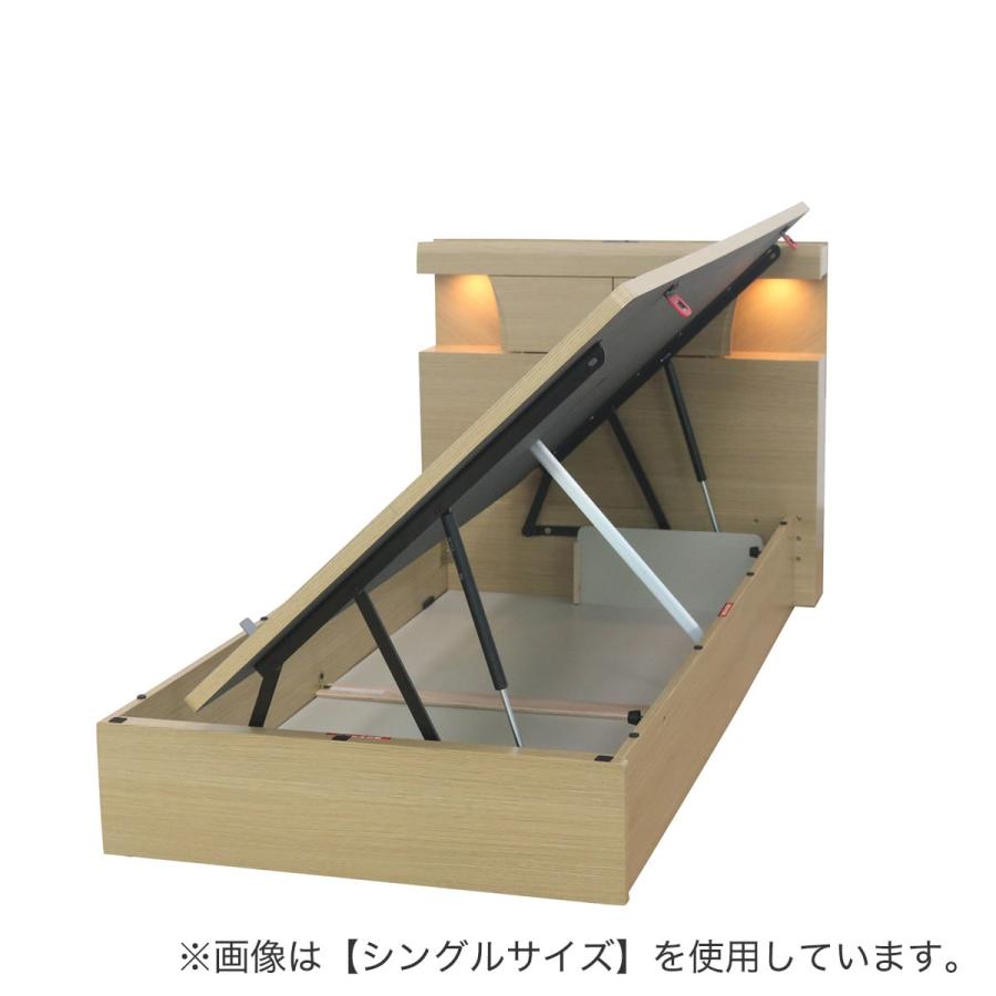 どんなお部屋にもなじむモダンデザイン。跳ね上げ式の収納ベッドでベッド下一面が、収納スペースで中身が一気に見渡せ、たっぷり収納。棚付き、2口コンセントとモダンライト付き。、一人暮らし、狭い部屋にもぴったり、おすすめです。