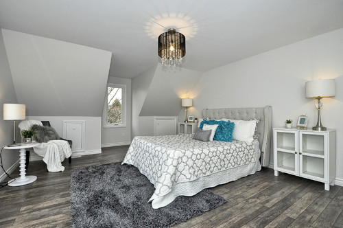 こちらのシャビーシックなベッドルームは、ホワイトを基調に、家具に、大きなベッドも淡いグレーで、パネルヘッドは、キルティングが、施されています。